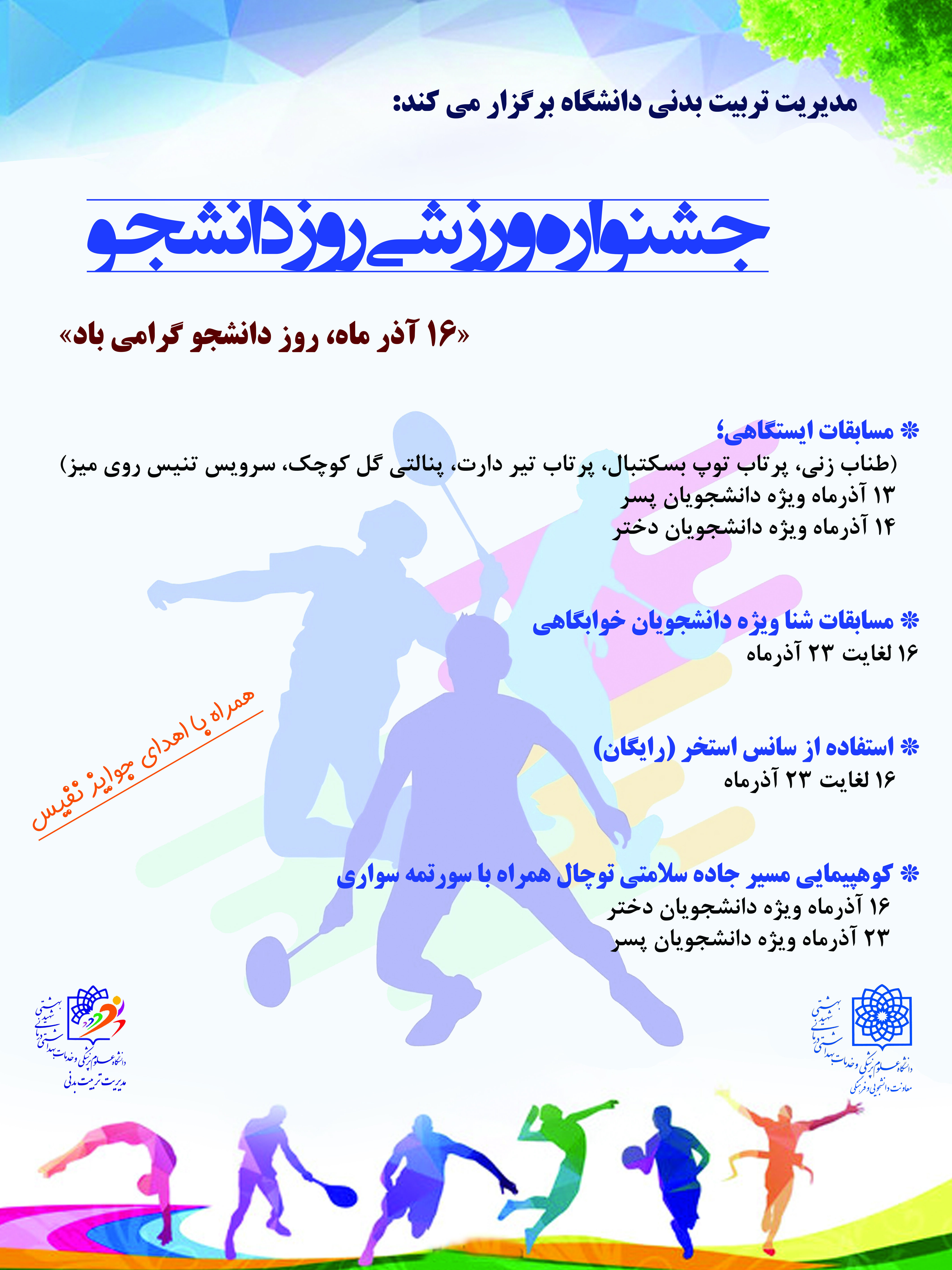 به گزارش روابط عمومی مدیریت تربیت بدنی دانشگاه – به مناسبت 16 آذر (روز دانشجو)، جشنواره ورزشی همراه با مسابقات متنوع از روز 13 لغایت 23 آذر ماه برگزار خواهد شد.