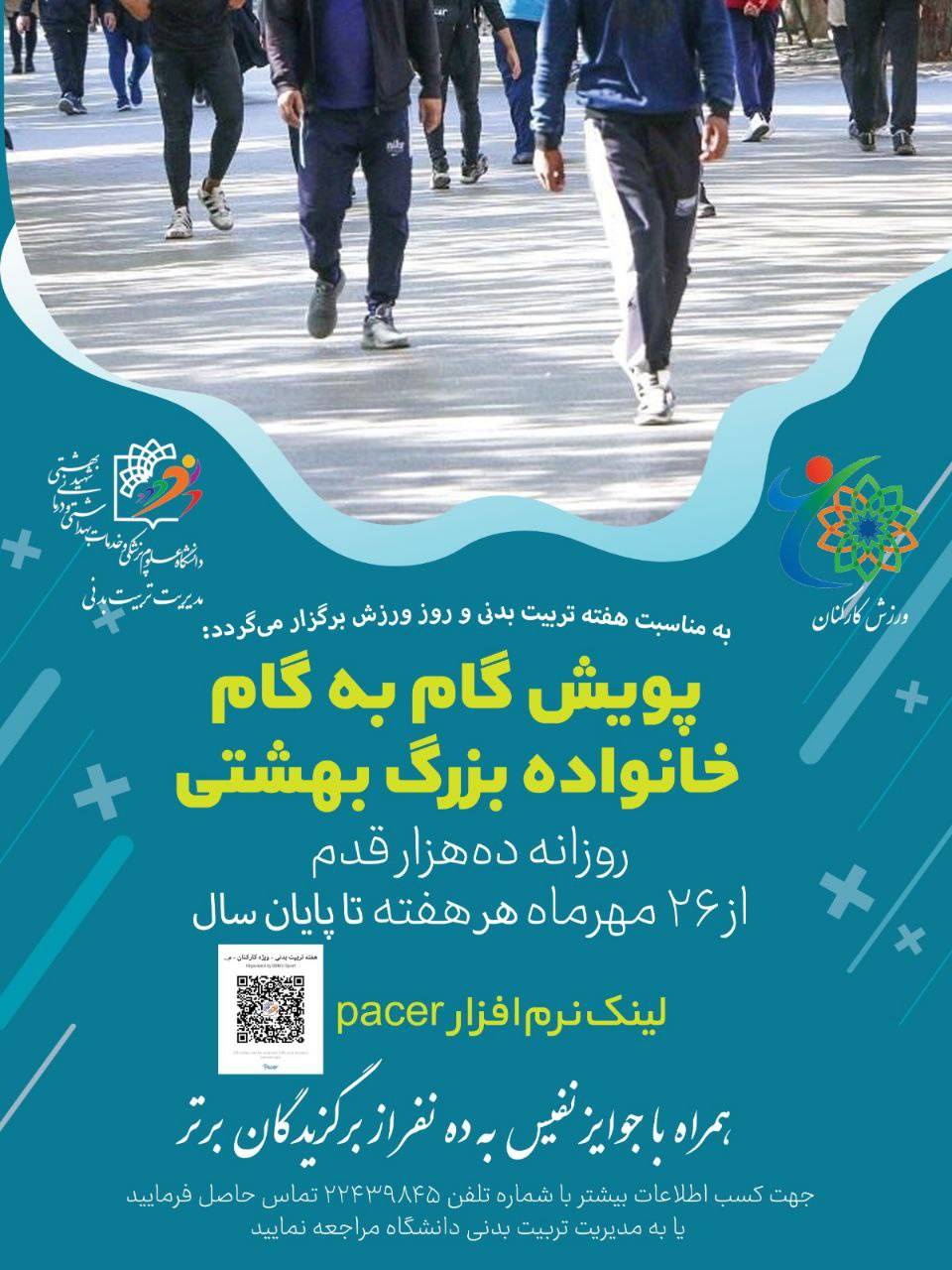 با برنامه ریزی های صورت گرفته از سوی مدیریت تربیت بدنی و امور ورزش کارکنان دانشگاه، از روز ۲۶ مهر لغایت ۲ آبان ماه به مناسبت « هفته تربیت بدنی و ورزش» و با هدف «نهادینه سازی فرهنگ ورزش همگانی» و «ترویج سبک زندگی سالم»، پویش پیاده روی «گام به گام تا تندرستی» ویژه کارکنان آقا و خانم دانشگاه برگزار می گردد. پویش پیاده روی گام به گام تا تندرستی با ثبت حداقل ۱۰,۰۰۰ قدم در هر روز در نرم افزار Pacer انجام می شود و شرکت در این پویش رایگان و برای تمام کارکنان دانشگاه آزاد است.